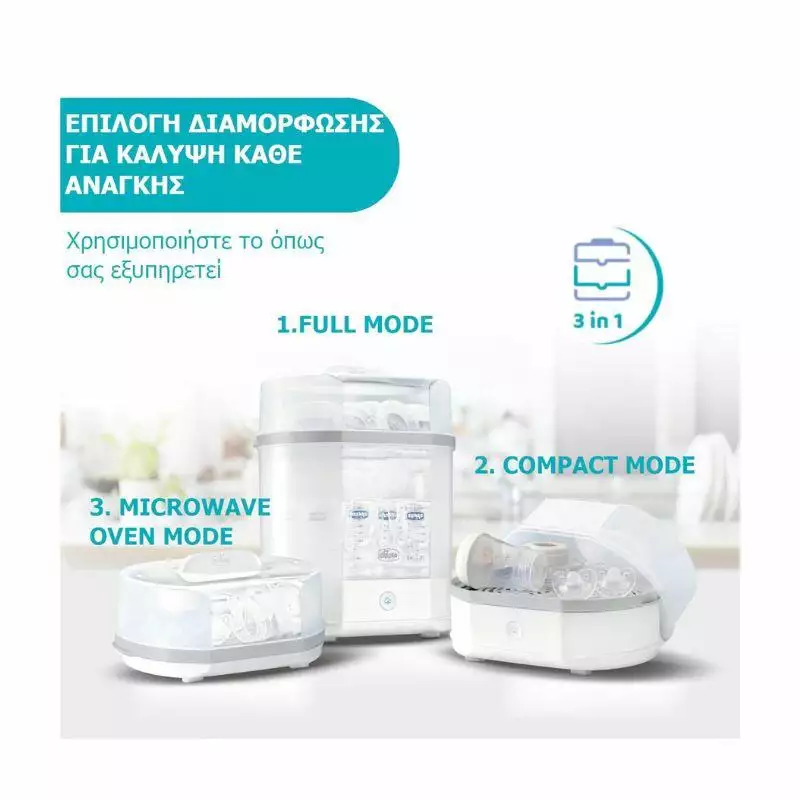 2) COMPACT: For sterilizing up to 2 330ml/11oz baby bottles of all Chicco ranges with the relevant accessories or other small items such as pacifiers.