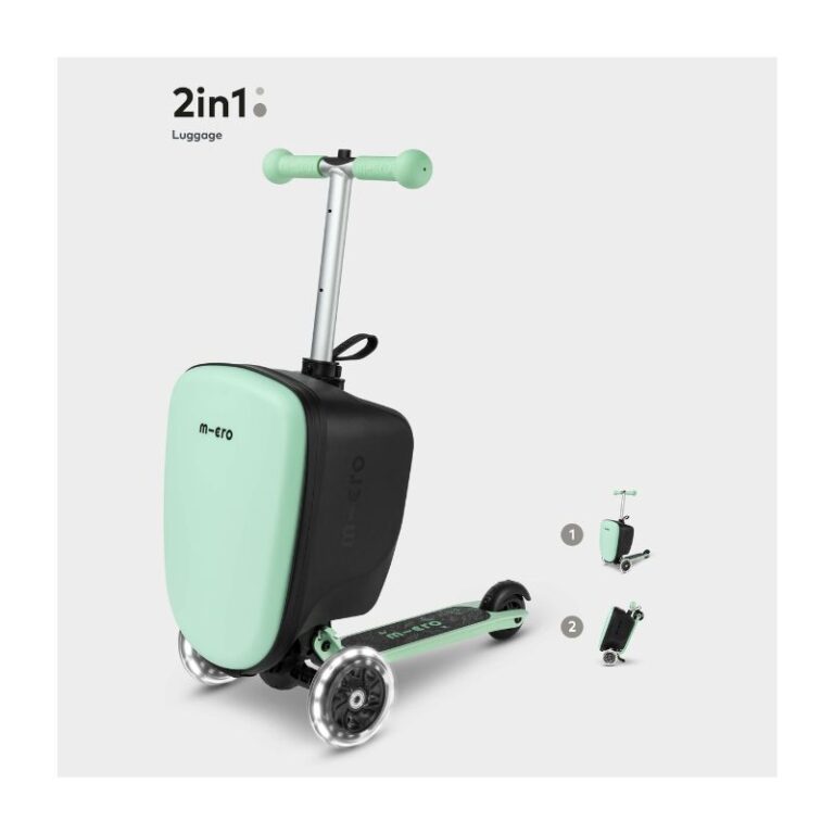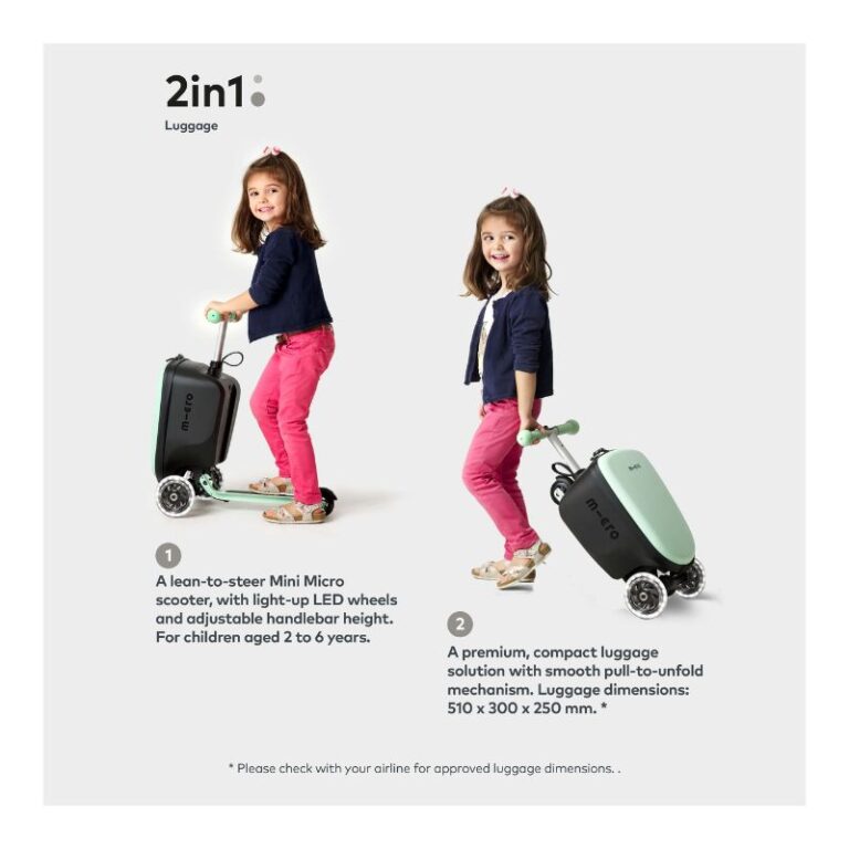 Make the journey part of the adventure. The  Mini Micro Suitcase Scooter is set to be a huge hit with intrepid explorers seeking independence at the departure gate. Ensure kids are always entertained on the go. The large 13-litre capacity is luggage approved and big enough to pack your holiday essentials, including books, games and even a teddy, which can come with you on your travels (including onto the plane). Keep all your favourite possessions safe and secure thanks to a weatherproof concealed zip. The smooth pull-to-unfold mechanism is effortless and user-friendly and ensures no pinches or finger trapping. A premium, compact luggage solution. Once folded, the kickplate is flush with the luggage section meaning internal space isn’t compromised. The folded dimensions mean that the  Mini Micro Suitcase Scooter can be easily stowed in overhead lockers or the footwell of the car so that it is easy to access during any journey. The intelligent safety feature on the adjustable stem prevents collapse. Its clever hidden third wheel acts as a kickstand, keeping it upright and stable when folded and easy for children to pull independently. The premium solid outer shell is weatherproof and easy to keep clean. The luggage section of the scooter suitcase is intuitively designed to be raised off the ground, keeping it clean and dry and able to glide over bumpy ground. Extend the handlebar of the folded scooter to allow children to walk and wheel their luggage to the gate; alternatively, flip down the kickboard for children to hop on and scoot their own way. For travel without the drama. Whether on the road, in the air or by rail, the Mini Micro Suitcase Scooter is the perfect travel companion. Includes a rear reflector and light up LED wheels for increased visibility whilst on the go. Beautifully thought through, expertly engineered. Built to last. Built to outlast. *Please check with your airline for approved luggage dimensions.